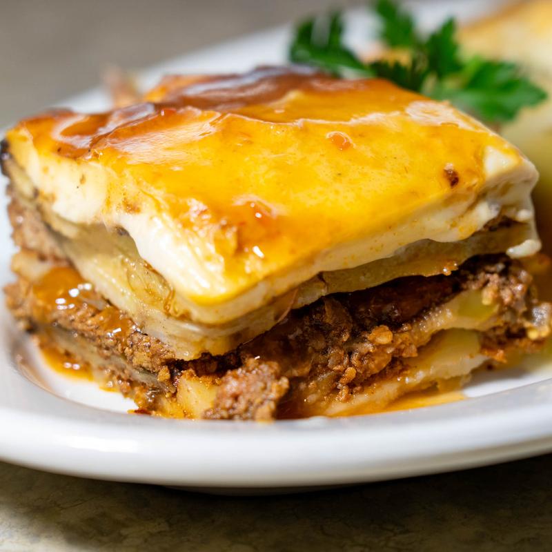 Baked eggplant, ground meat, and potato casserole topped with bechamel sauce.