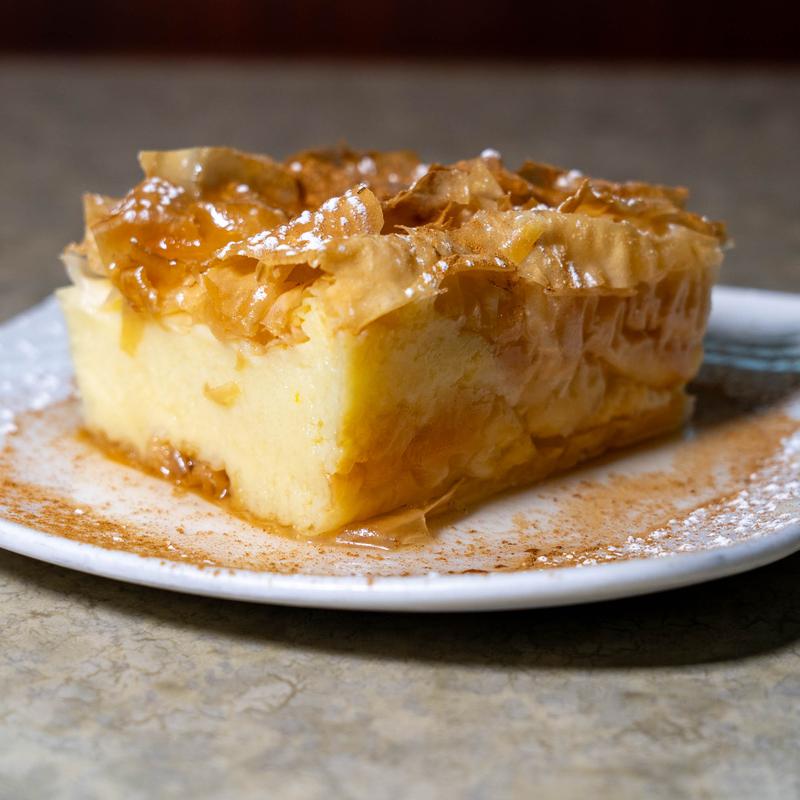 Layers of spinach and feta cheese baked in flaky filo dough with choice of side.