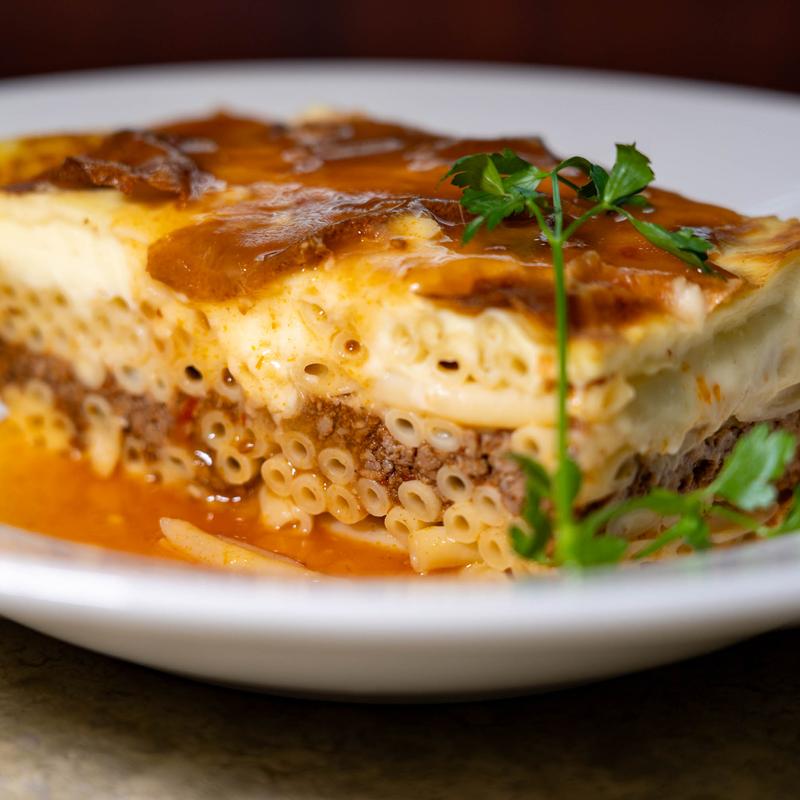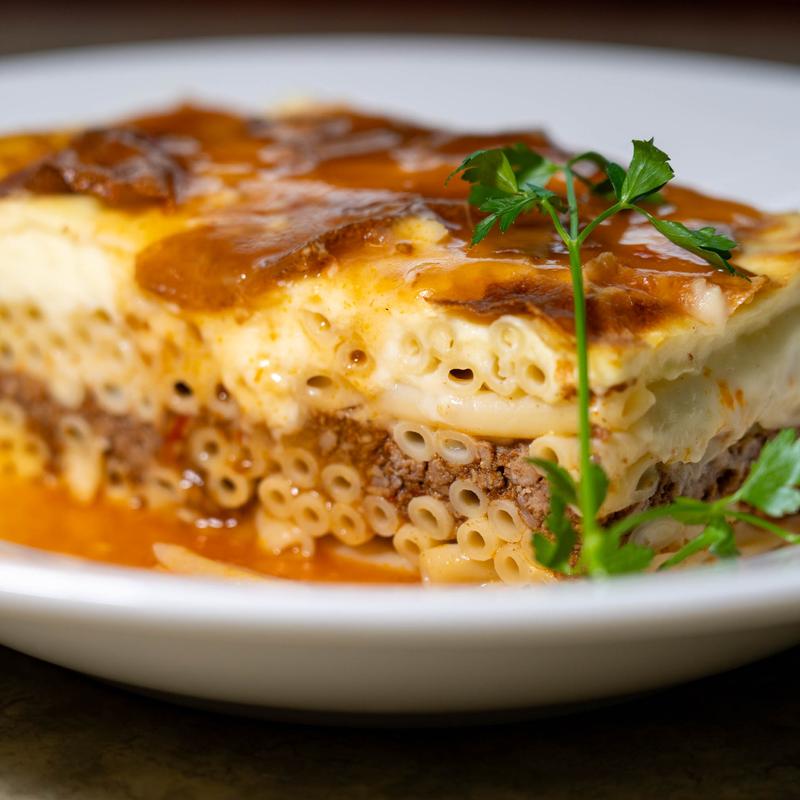 Baked pasta, ground meat, and cheese casserole topped with bechamel sauce.